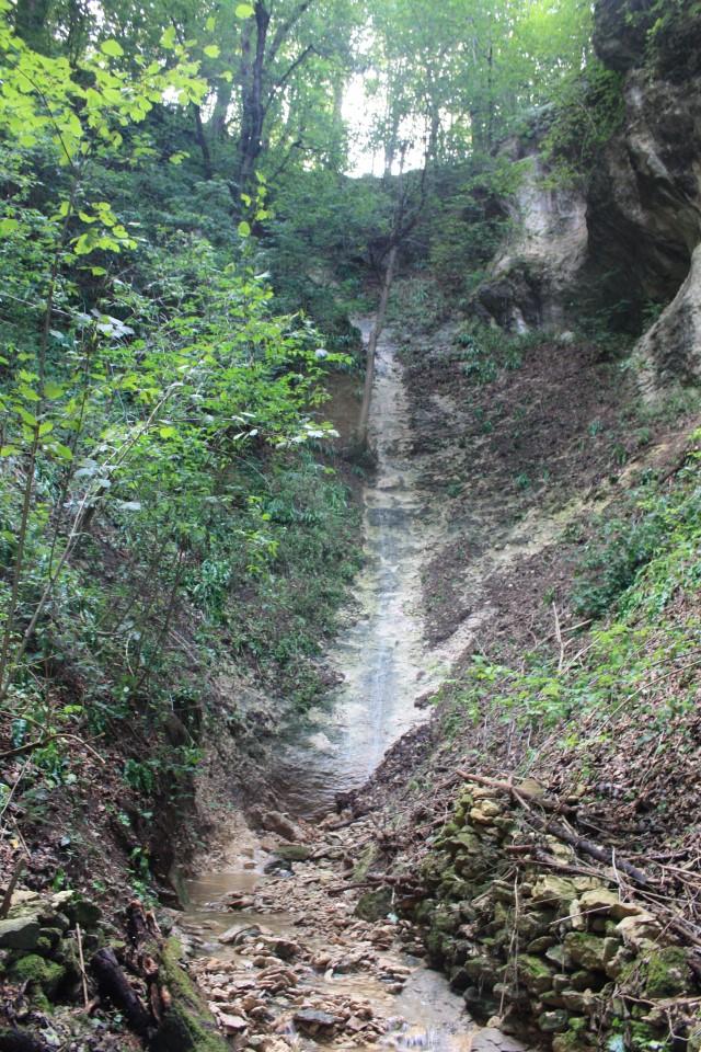 Stalni izvir je skozi tisočletja izdolbel kratko sotesko, nad katero se dviguje okoli 30 metrov visoka, bleščeče bela stena apnenca. Veter, voda, sonce in zmrzal ne dopuščajo, da bi se stena porasla z zelenjem, pač pa jo intenzivno drobijo v grušč, ki zasipa pobočje in okolico izvira.